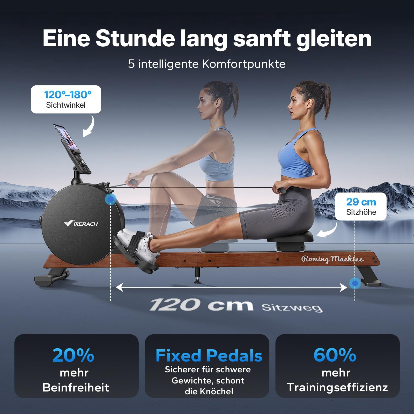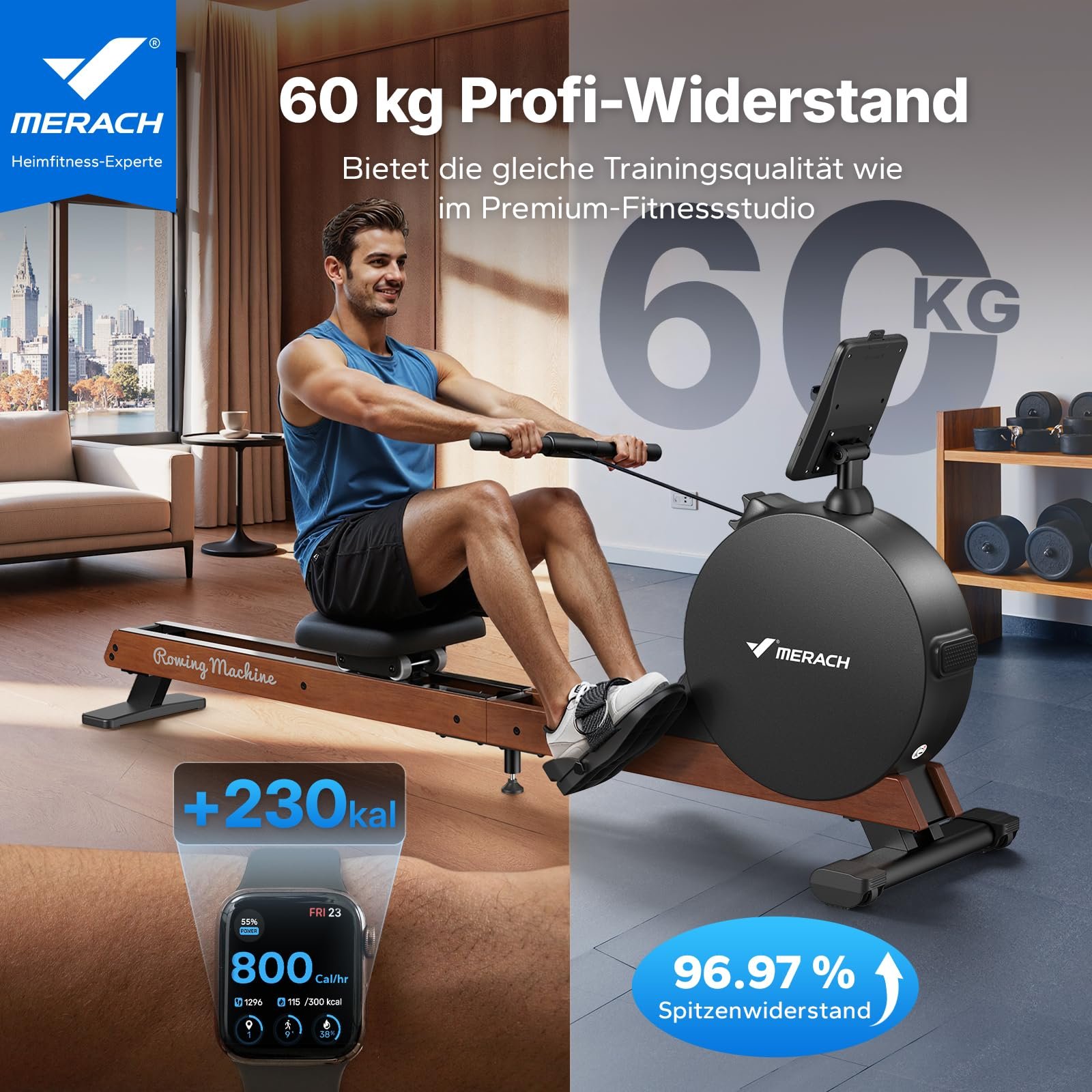 MERACH Rudergerät für Zuhause, Eigenerzeugung, Verbesserter Magnetischer Spitzenwiderstand von 60 kg, Automatische Widerstandsanpassung, Doppelte Holzschienen, LED-Anzeige, Professionelles (R21)