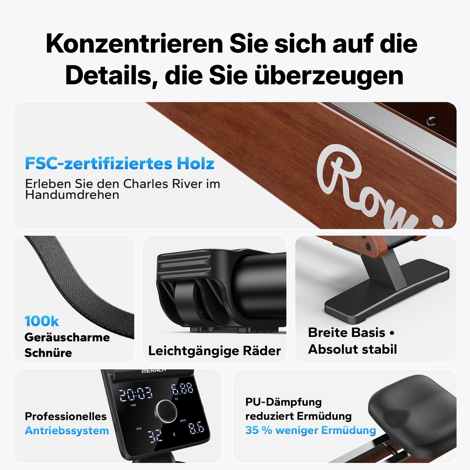 - FSC-zertifiziert: Die Rudergeräteschienen bestehen aus FSC-zertifiziertem Holz. Der FSC-zertifizierte Massivholzrahmen und das geräuscharme Kabelsystem sorgen für ein Betriebsgeräusch von unter 40 dB und ermöglichen so nächtliches Training, ohne die Ruhe der Familie zu stören.