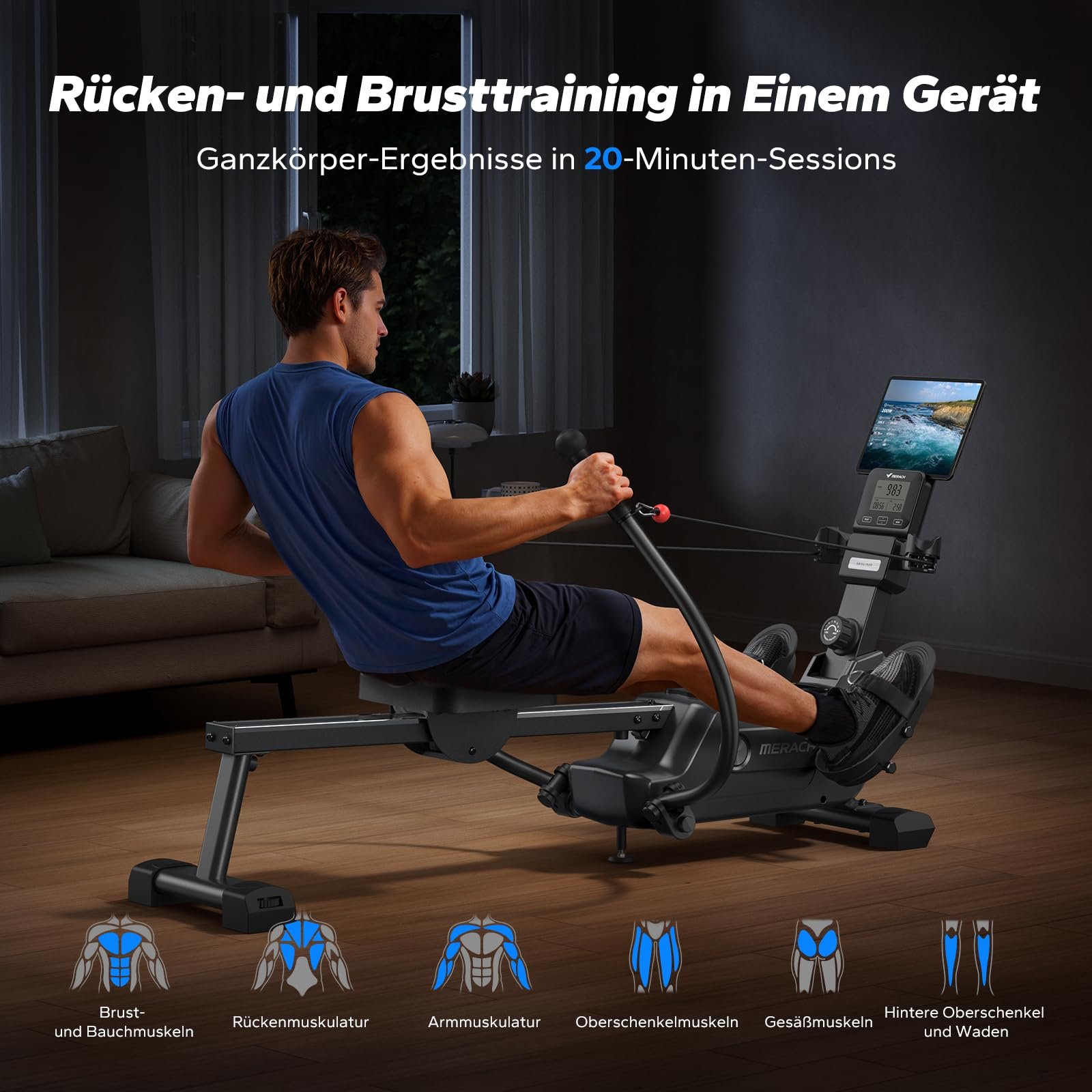MERACH Magnetisches Rudergerät für Zuhause, Bluetooth Rudergeräte mit 16 Widerstandsstufen, Upgrade auf Doppel-Slide-Rails, Maximale Belastbarkeit von 158 KG, Vertikale Aufbewahrung, Platzersparnis